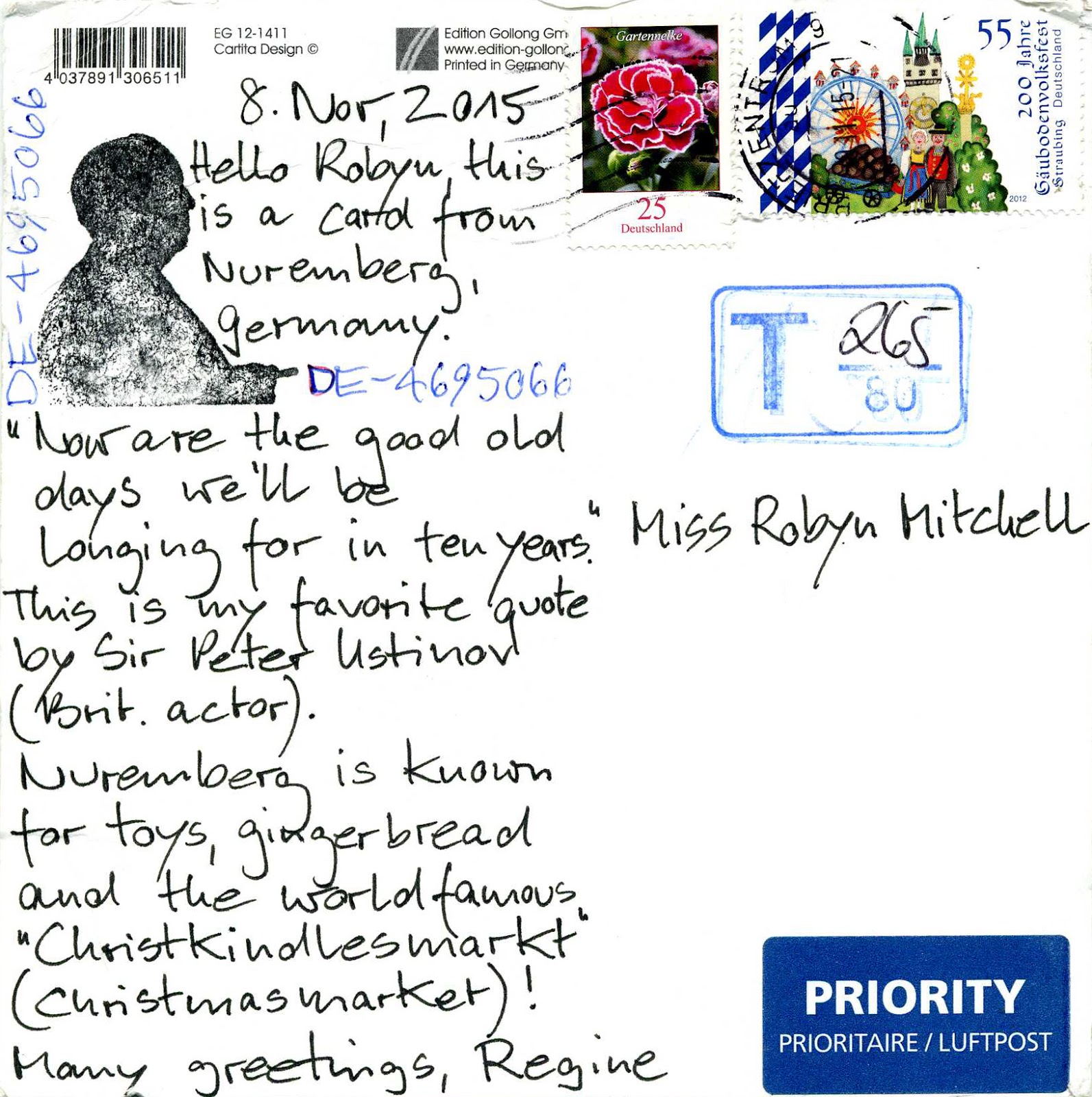 Such a lovely postcard from Regine in Germany! I love that the postcard says "Where do you want to go next?" especially as I've been to London, Paris and Rome and am dreaming of going to New York!
